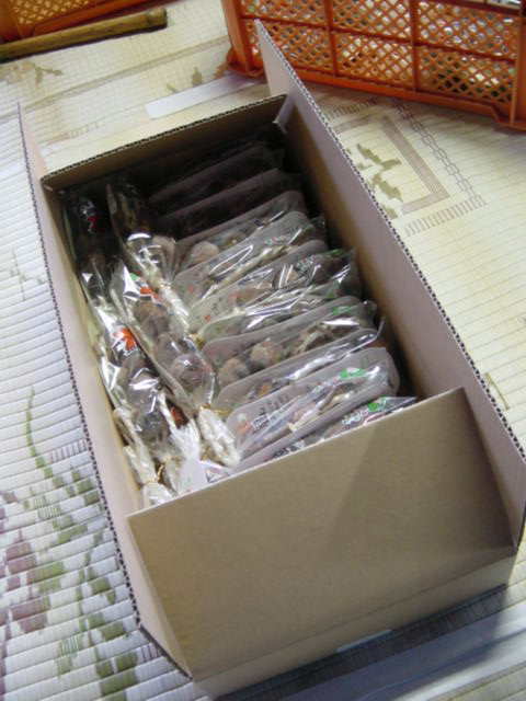 ![]() | 20袋を1箱に入れて、出荷! これは農協の無農薬干し柿として出荷されるそうです。 僕は普段はコンピュータと向き合う日々なので、(実際は袋詰しかしてないんだけど)生産したぜっ、という満足感に久しぶりにひたることができました。 |