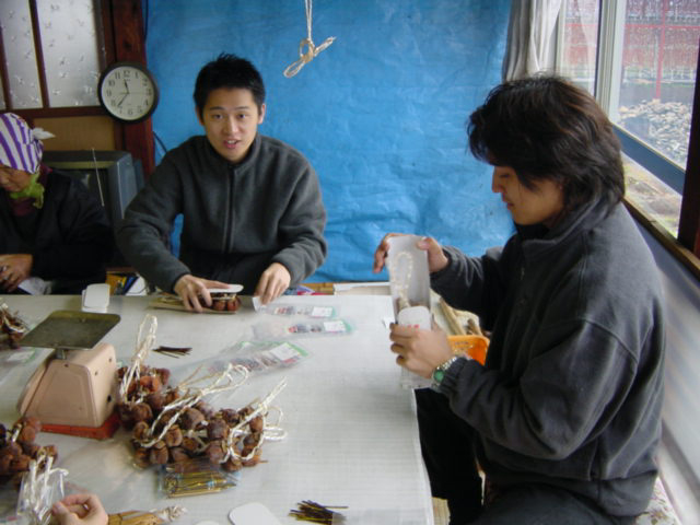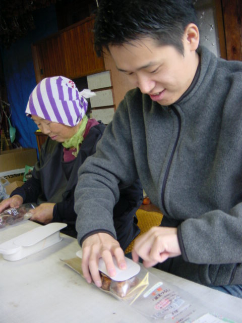 ![]() | 地元のおばあちゃんたちと一緒にこんなかんじで。 袋にキレイに詰め込むのが意外にたいへん。。。 おばあちゃんたちのようになかなかキレイに入らない。。 みようみまねで頑張って。 |