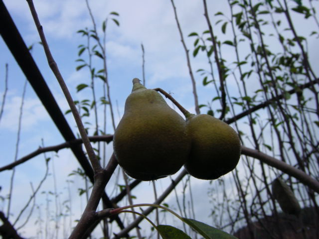 ![]() | もう冬なので畑には殆ど緑が残っていないですが、ラフランス畑にはこういう小さいラフランスがぽつぽつとあって、実が遅くできて大きくならないのでそのままにしているそうです。 |