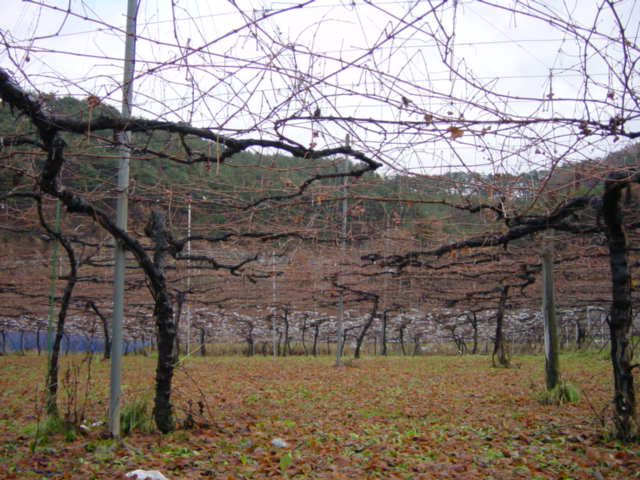 ![]() | ワイン用の葡萄畑です。奥の方に白いものが見えるでしょうか。 |