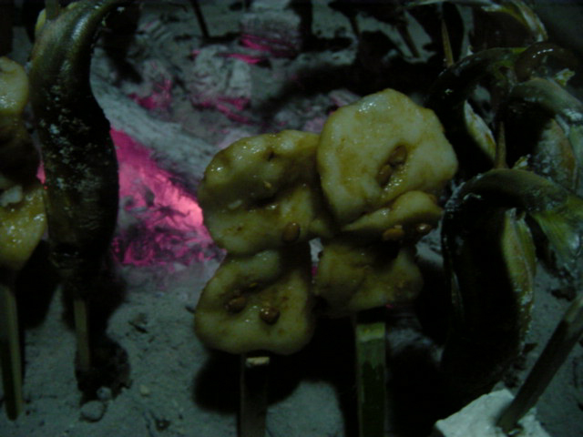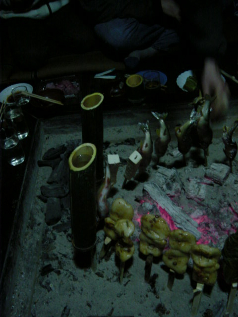![]() | 写真にうつっているのが、竹徳利入り日本酒、納豆餅、鮎の塩焼き(子持ち)、青菜餅、豆腐田楽で、その他いただいたのが、納豆汁、鯉の刺身(を丹野醤油につけて)でした。いやー幸せ。 |