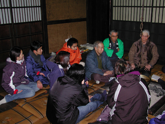 ![]() | 右から二人目が佐藤孝一さん。1,000以上の昔話をそらで覚えていらっしゃいます。なんと 83歳、大正三年生まれ。
