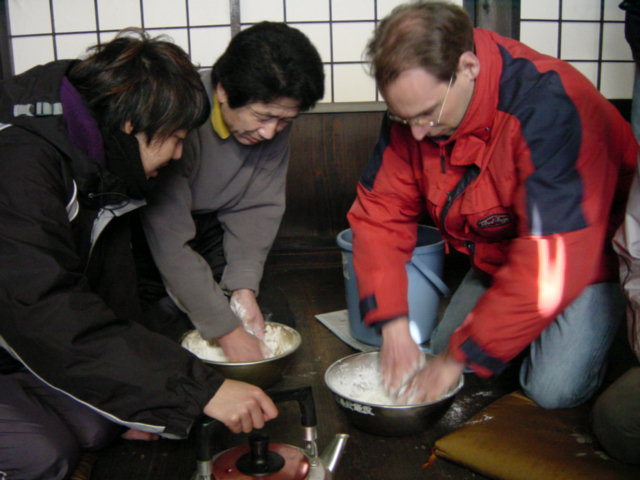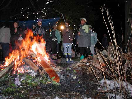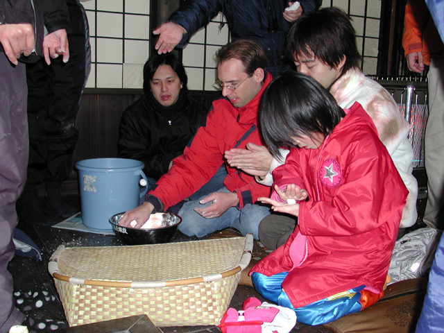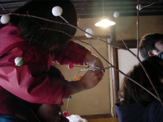 雪すべりをした後、農家の正月行事、「団子刺し」をしました。