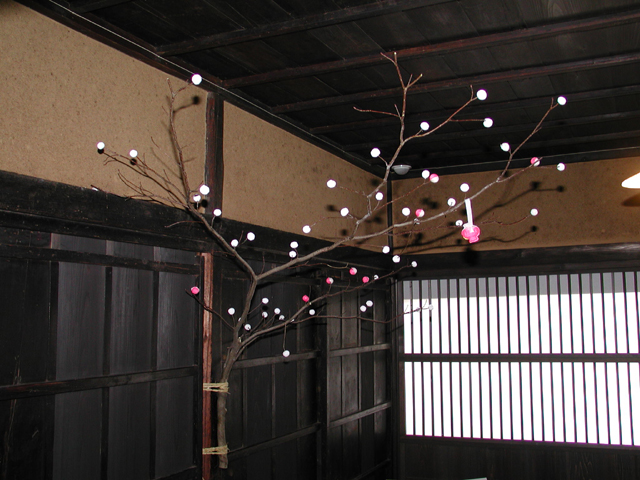 この「団子刺し」という正月行事は、一般的には、無病息災・家内安全・豊作等新年を迎えて祈るための飾りで、毎年2月11日を祝祝(いわいわ)として門松やお札、しめ飾り、お守り、破魔矢などを焼くわけですが、そのときにだんご木も焼くわけですね。その焼いた団子を食べると無常息災とか賢くなる等と言われています。ですから、ほんとは焼いてたべるまでが祈願なんですね。養蚕が盛んだった頃に、沢山の繭が取れるようにと願いをこめて米の粉で繭を形どった「だんご」を作って正月の飾りとしていた、という話もあるようです。
