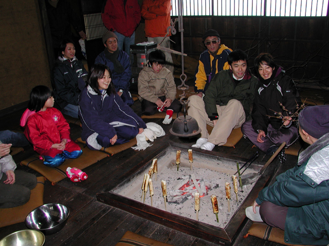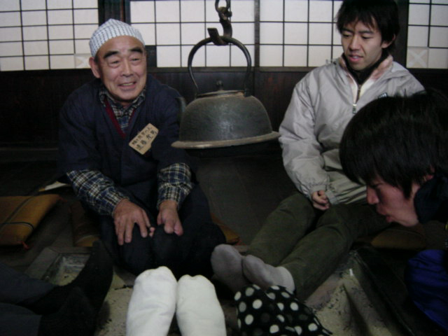 大黒屋の囲炉裏で足を暖める一同。昔はこうやってみんなやったんですねー。