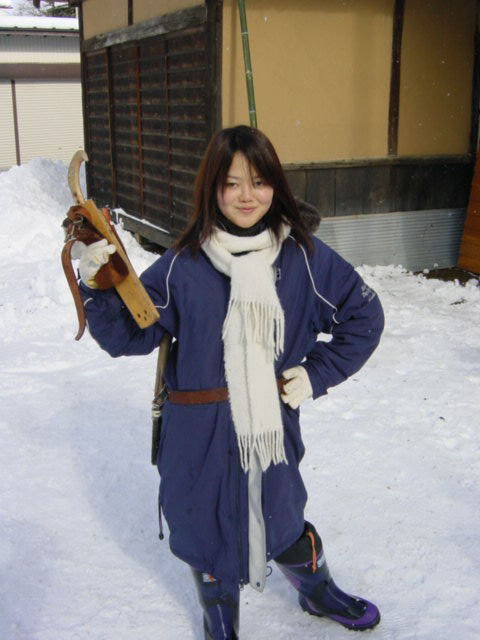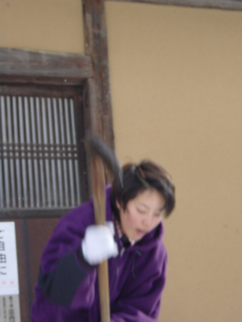 ![]() | まずは本職がお手本。後ろに見えるのが庄内屋。楢下に残された家屋の中では最も古く、18世紀中頃に建てられたものだそうです。 |