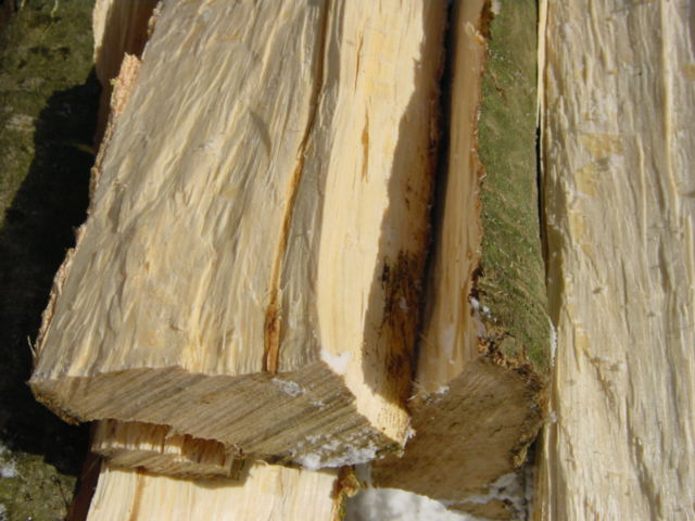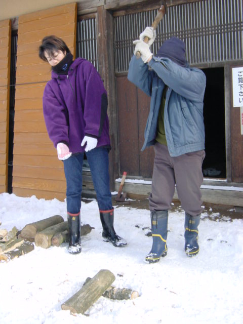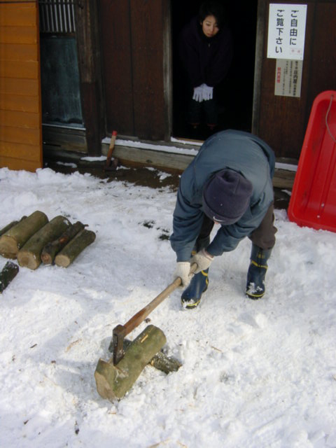 ![]() | こんな風に割っていきます。 本来は、切ってから時間がたつと堅くなってしまって割りにくくなるので、薪は山で割ってしまって、水分が蒸発して軽くなってからふもとに持ってくるそうです。 |