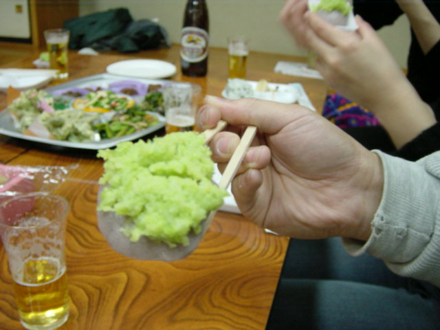 ![]() | 生姜じゃなくて、キク芋(タロイモ)。「からいも」とも呼ぶみたいですね。生命力が強い。 その他にも、鯉の甘辛煮、山菜のてんぷら、あさつきのぬた、などなど。市役所の(女性の)井上さんにはおにぎりを作っていただきました。 |