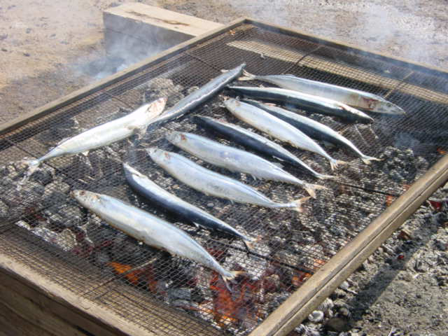 ![]() | 大豆を煮た残り火で秋刀魚を豪快に焼いてしまいます。 |