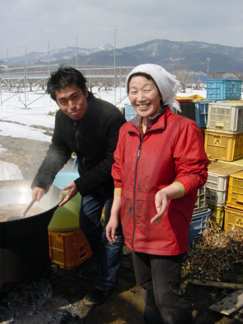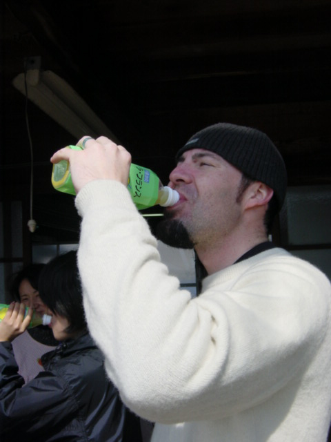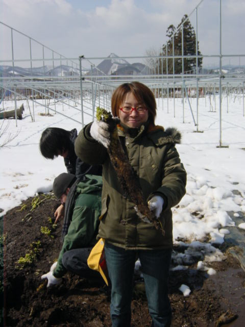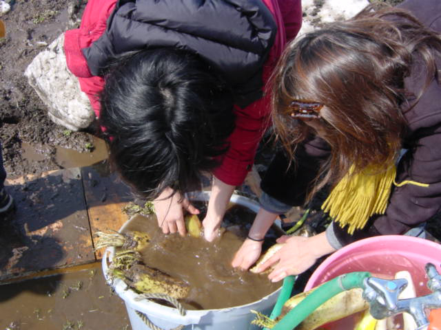 ![]() | 泥だらけの野菜を井戸水で洗います。井戸水は冬暖かくて夏冷たいとよく言いますが、ホントに暖かいんですね。しかも美味しい。 |