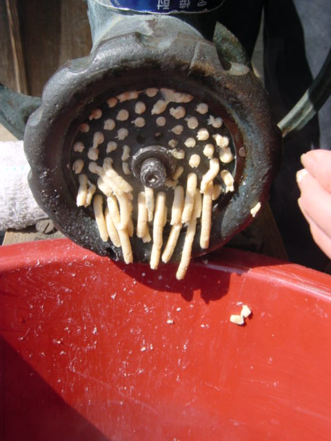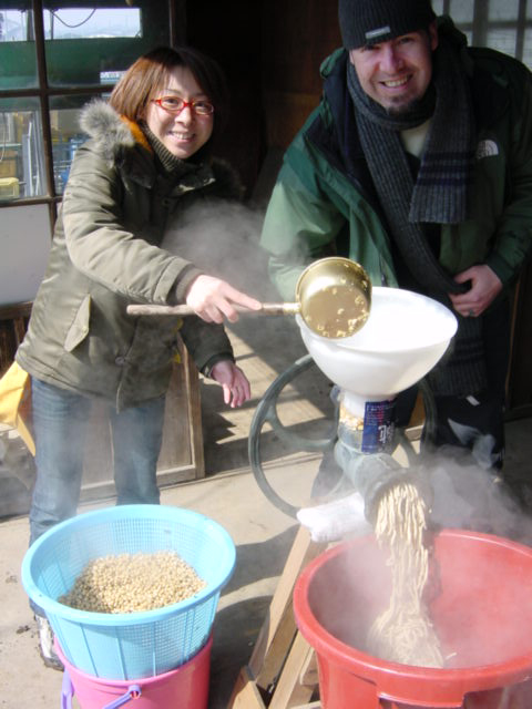 ![]() | 潰し器をぐるぐる回して大豆をつぶしていきます。 |