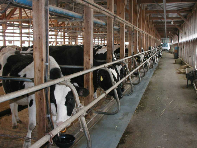 ![]() | 北沢さんのご親戚の酪農家のお宅を訪れました。清潔な牛舎に約60頭の乳牛と子牛がいます。 |