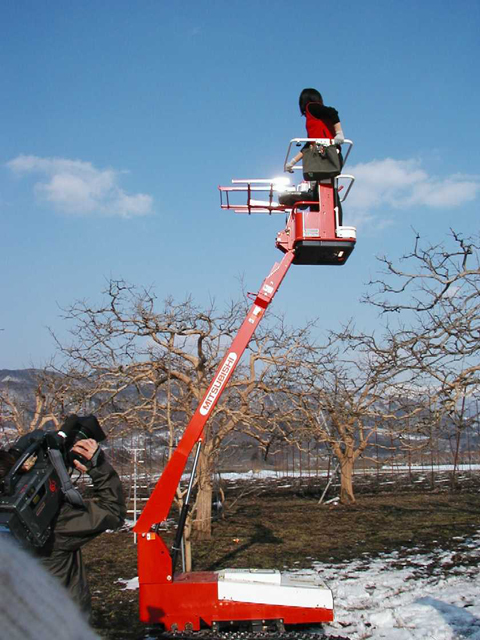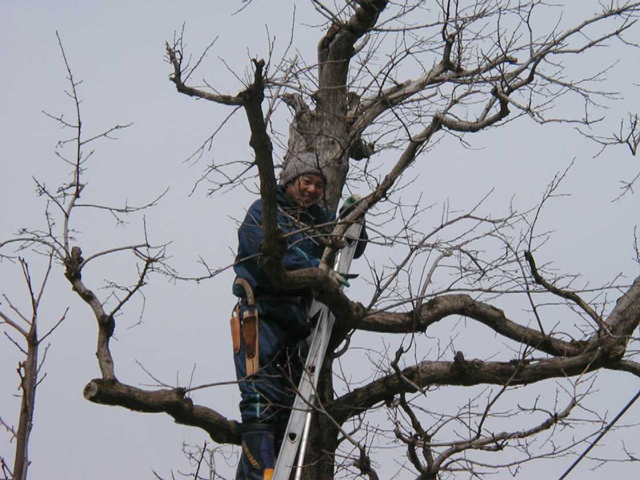 ![]() | 背が高い木は、ちゃんとはしごでのぼって枝を落とします。のぼってるのが、今回お世話になった北沢さんの息子さん。 |