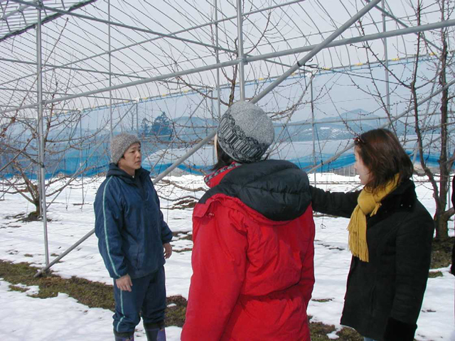 ![]() | まずはさくらんぼ畑で話を聞く参加者。この背の高い骨組みに自分たちでシートをかけてビニールハウスにするそうです。 |