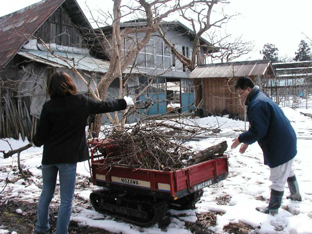 ![]() | 柿の木の剪定した枝を集めます。名産“紅柿”を作ってるので、ほんと至るところに柿の木があるんです。 |
