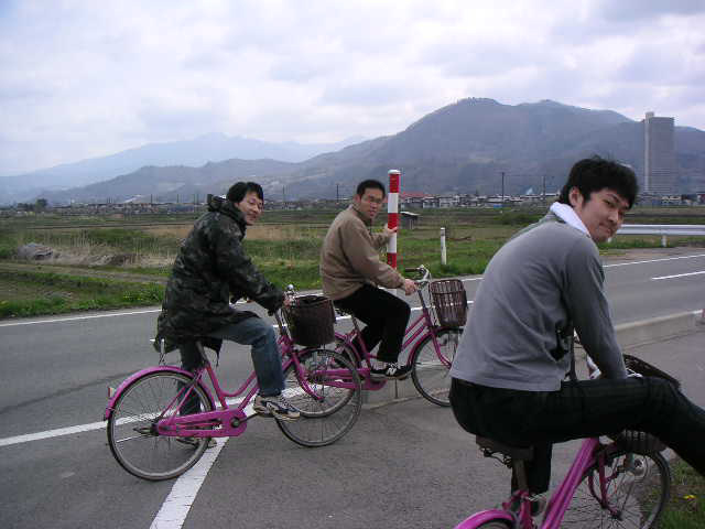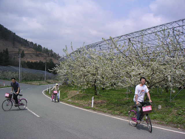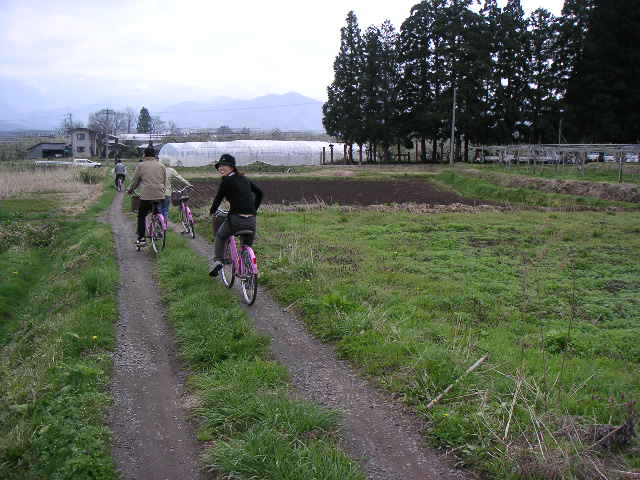 ![]() | かみのやま温泉駅付近にはレンタサイクルがないので、3つの宿から自転車を貸して頂いて出発。 今回は、駅の東北に向かっていって、フルーツライン(果樹園地帯を通る道路)にぶつかってから、西に向かい、時の果実で一服してから萱滝へ、というコースにしました。 |