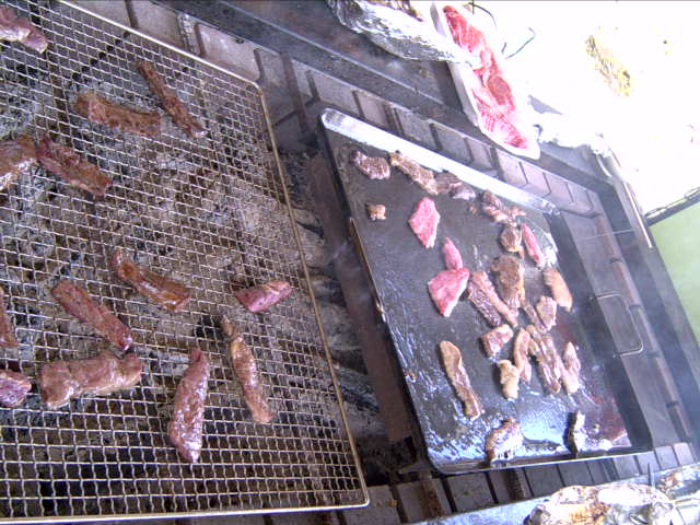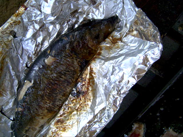 ![]() | 昼食は外でバーベキュー。ニシンのホイル包み焼きと焼肉。 |