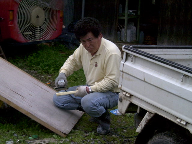 ![]() | さくらんぼの植え替え用の道具を作るMr長沼さん。 |