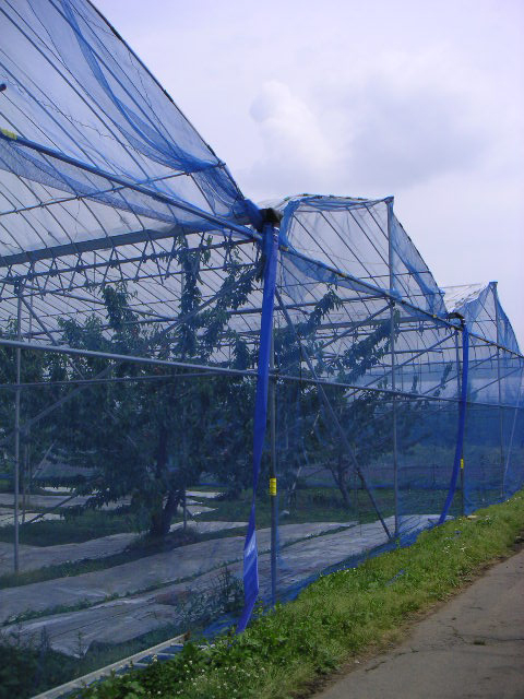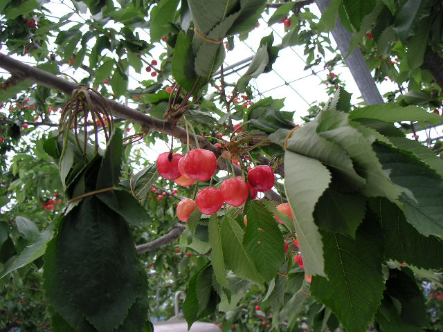 ![]() | さくらんぼ畑にハウス栽培が多いのは、鳥を防ぐといった理由の他、雨にあたると浸透圧でさくらんぼが割れてしまうためです。 |