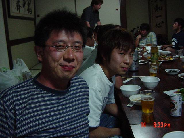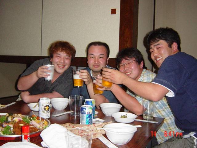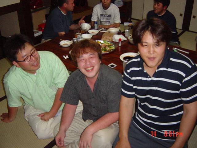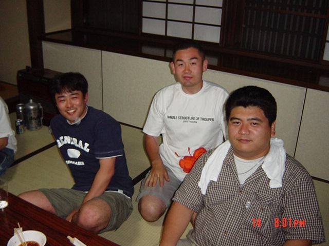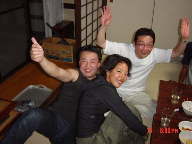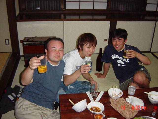 ![]() | 交流会途中に携帯電話で呼び出され、大雨の中かけつけてくれたミツルさん(一番右)。ナオヤさん(中央)とオガタさん(左)に「何で今日休んだんだよ?!おせーよ!」とつっこまれていました。 |