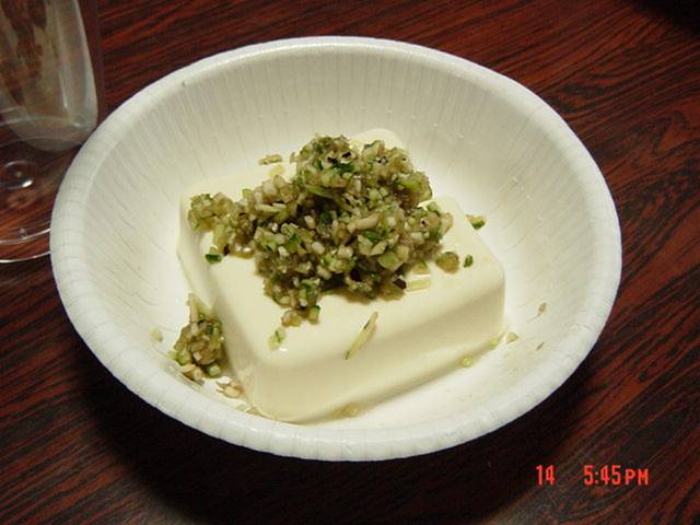 ![]() | こちらも山形県の郷土料理のひとつ、「ダシ」(お豆腐の上にたんまりのっかってるやつです)。(おそらく)塩もみしたキュウリ、カブ、ショウガ、ミョウガ等々の野菜をかなり細かいみじん切りにしてあります。こちらだとどこの家庭でも出てくるポピュラーなものだとか。漬物好きにはたまりませんね。 |