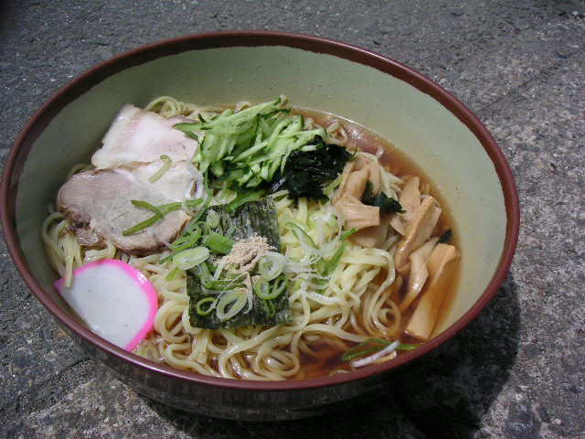 ![]() | お昼は冷やしラーメンです。冷やし中華でもラーメンでもなく、「冷やしラーメン」。氷が入ってます。こちらでは普通のメニューのようです。 |