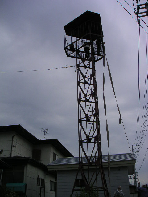 ![]() | なんと!泥上げが終わった後に、火の見櫓に登らせてもらいました!上山市には、それぞれの地区に1つぐらいこういう「火のみやぐら」が残っていて、頻繁に見かけます。例えば相生地区ではここ。町内放送等に今でも使われています。 |