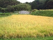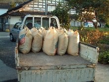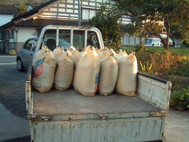 そのまま袋詰めされ,トラックでJAのライスセンターへ出荷されます。 僕らが刈った稲もその一部になるのでしょう。 |