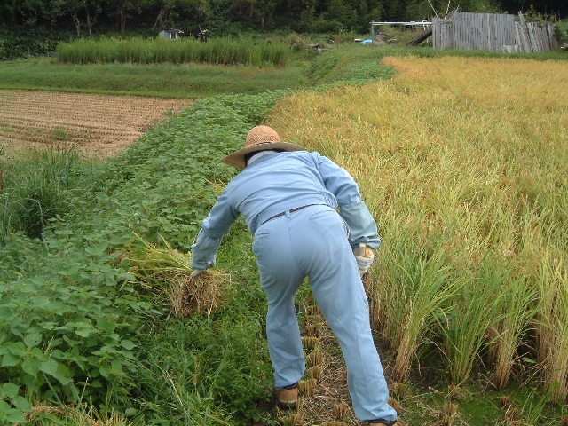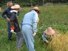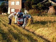今日の我々の作業は,機械で刈り取れない「端」や,「角」の部分の稲を手で刈るもの。 | |