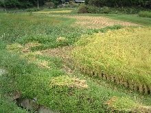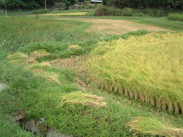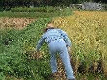 手で刈った稲は,ある程度束ねて,あぜ道に置いて行きます。 |