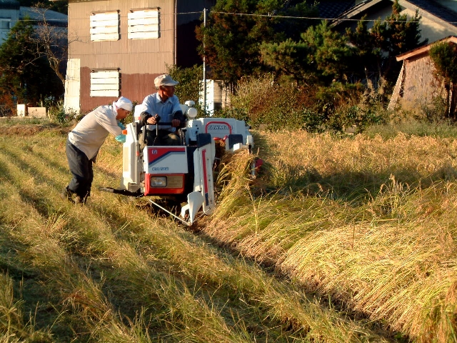 夕方,コンバインでの収穫を見せてもらいました。手刈りと比べると当然速い!! 一気にモミになります。 |