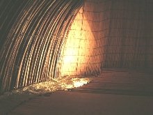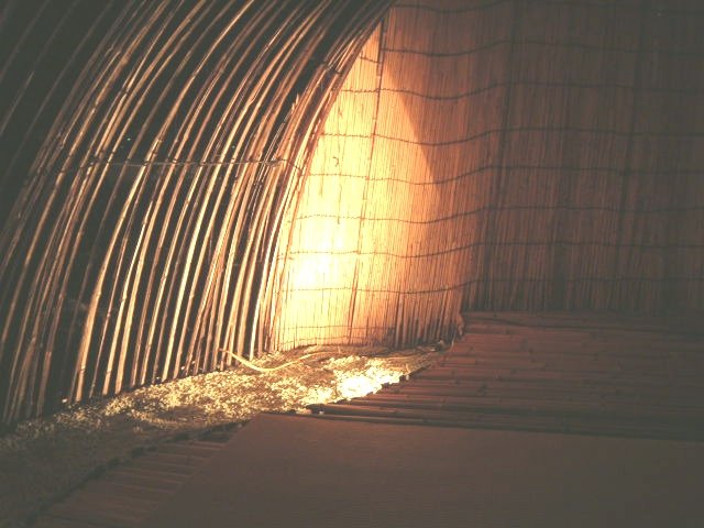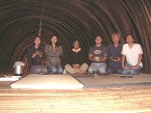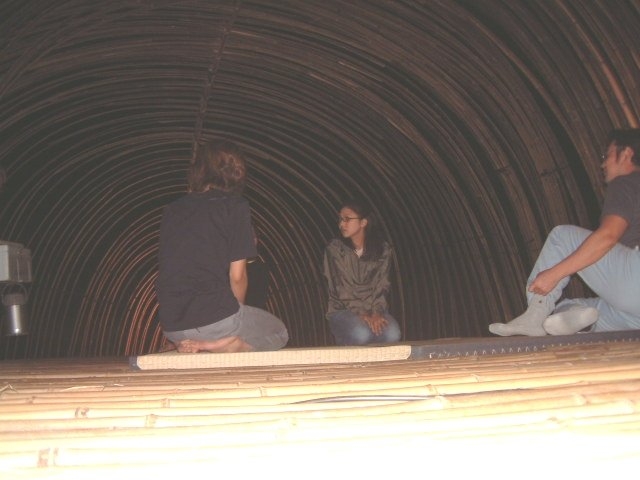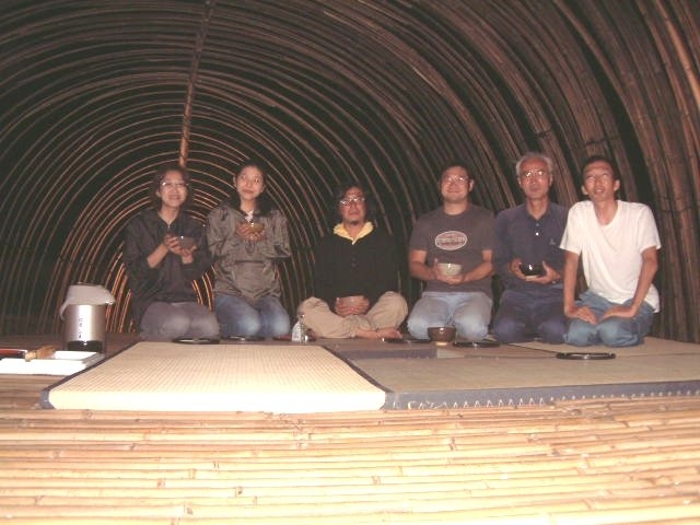 夕食後、こんなところに来ました. 何かわかる? 実は,5月に我々が伐採した竹で作られた茶室!武蔵野美術大の学生が作ったそうです。 う~ん芸術の秋。 |