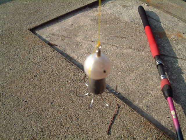 タコの仕掛けはこんな疑似餌(つまりルアー)。 タコがキラキラした円い球に絡み付いてきたところを引っ掛けます. |