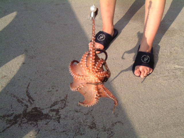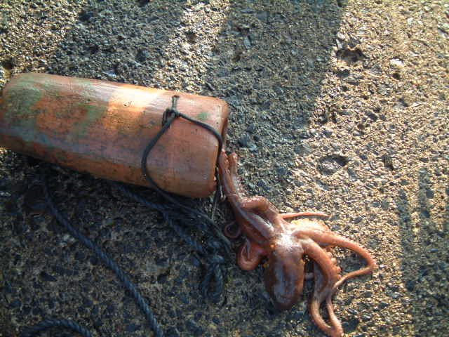 釣り上げられたタコ。活きたタコは逃げようとします。 |