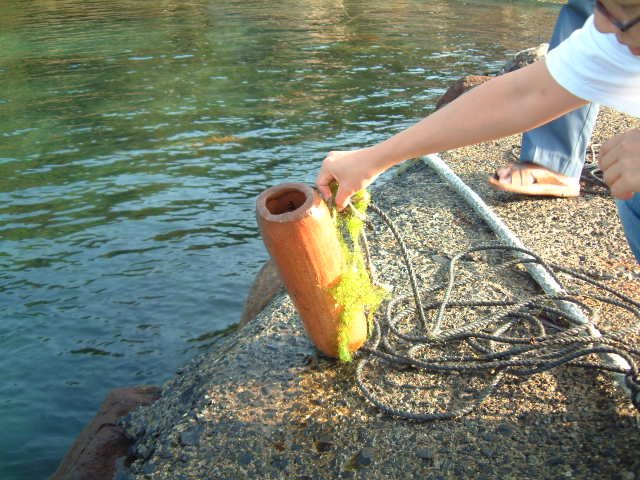 新田さんが前日に仕掛けておいてくれた蛸壺を上げます. |