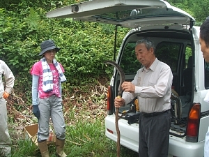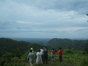 作業終了後、越渡さんに、山の頂上で話を聞きました。 |