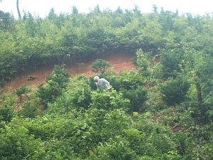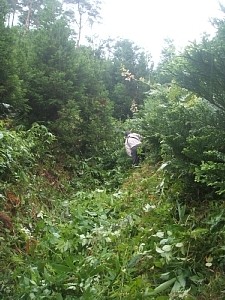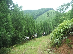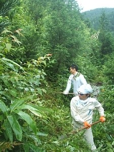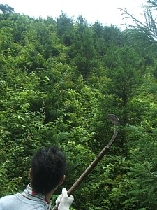 もう一つの作業は、山林の下草刈り。 大きな鎌を持って、山の斜面に挑みます。 |