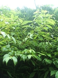 今日の作業の一つは、杉の枝打ち。雨の中、道端のやりやすい部分の枝を落とします。 みんな、モサモサの杉の木の中に体を入れて、モクモクと枝打ちをしています。 |