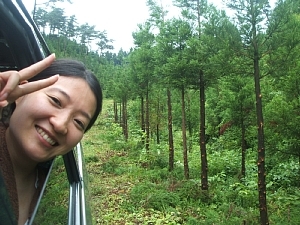 枝打ちした杉とともにピース! 雨でビショビショでしたが、かなり気持ちいい。 |