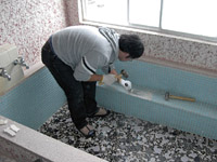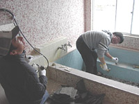 | 作業開始。まずは浴室タイルはがしです、重いハンマーとタガネでタイルをはがします。