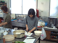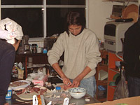 ![]() | 夕方には,枝打ち班が合流.食事の用意を始めます. 池上さんの奥さんが魚をさばいていきます. 写真は,マグロの「なかおち」をとっているところ. 皆,興味津々. |