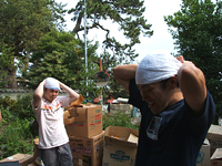 ![]() | 午後も作業です。頭のタオルを巻き直して、大量の荷物に挑みます。 |