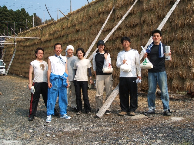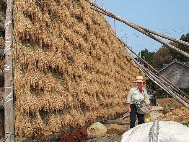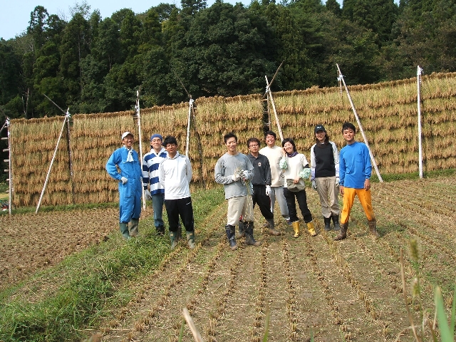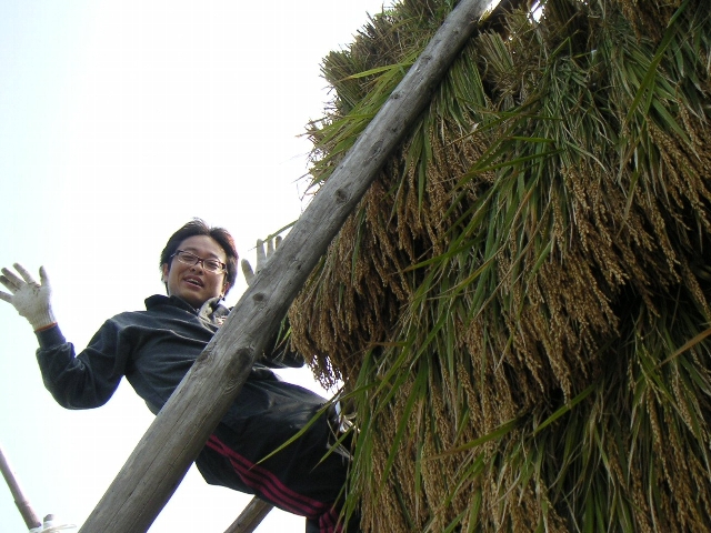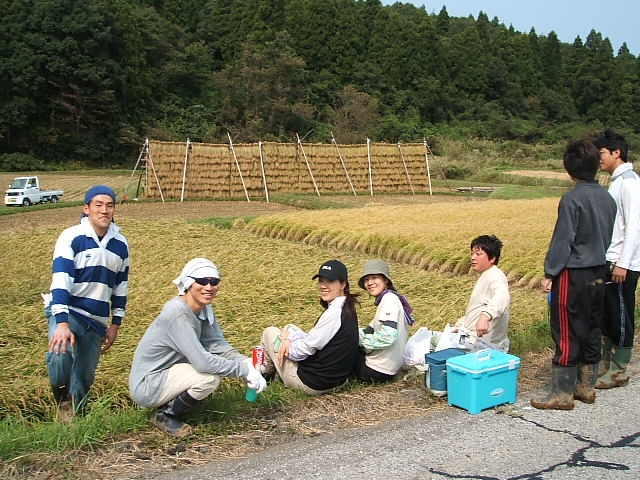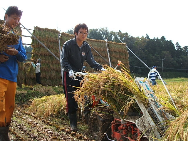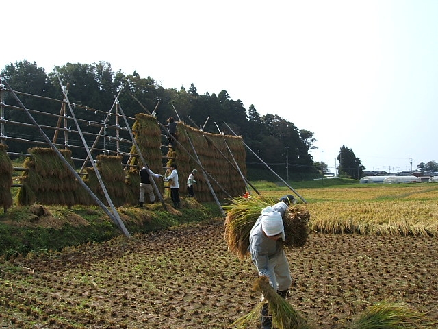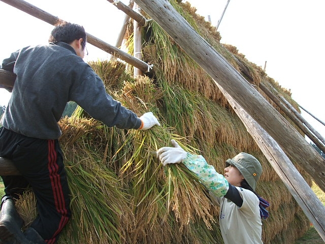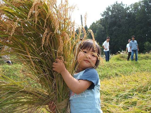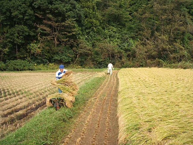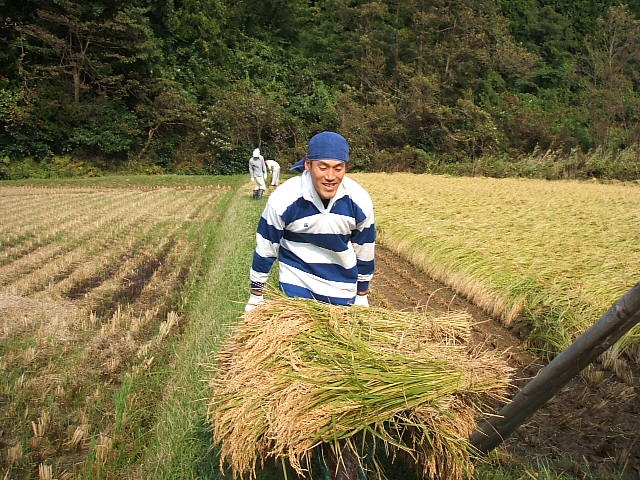 朝食を食べ、作業開始。いつもの通り、二日目は自分から動けるようになります。 稲の束を一輪車に積み、運ぶ! |
